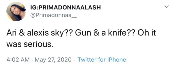 Ari and Alexis Sky got into scuffle tonight which involved a gun and knife apparently.