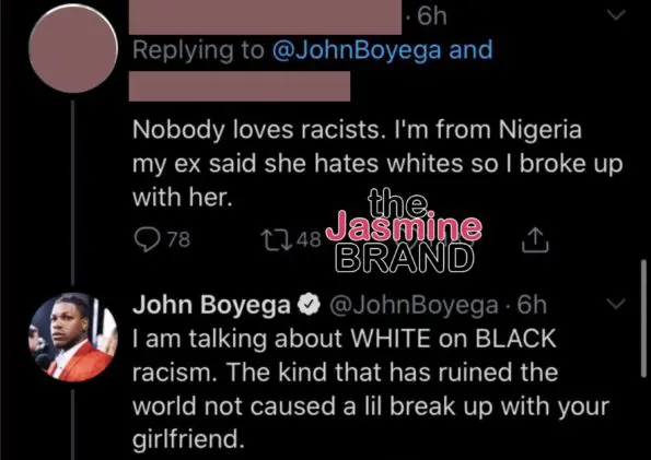 And, for a Twitter user that called John’s comment ignorant and referenced to their own personal life, Boyega reacted: