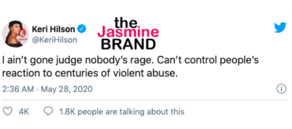 As previously reported, members of the community and public figures have been voicing their issue with the tragedy of George Floyd’s death. Singer Keri Hilson recently tweeted her thoughts on the riots and protests that ensued last night, and she is not judging how anyone decided to show their rage.