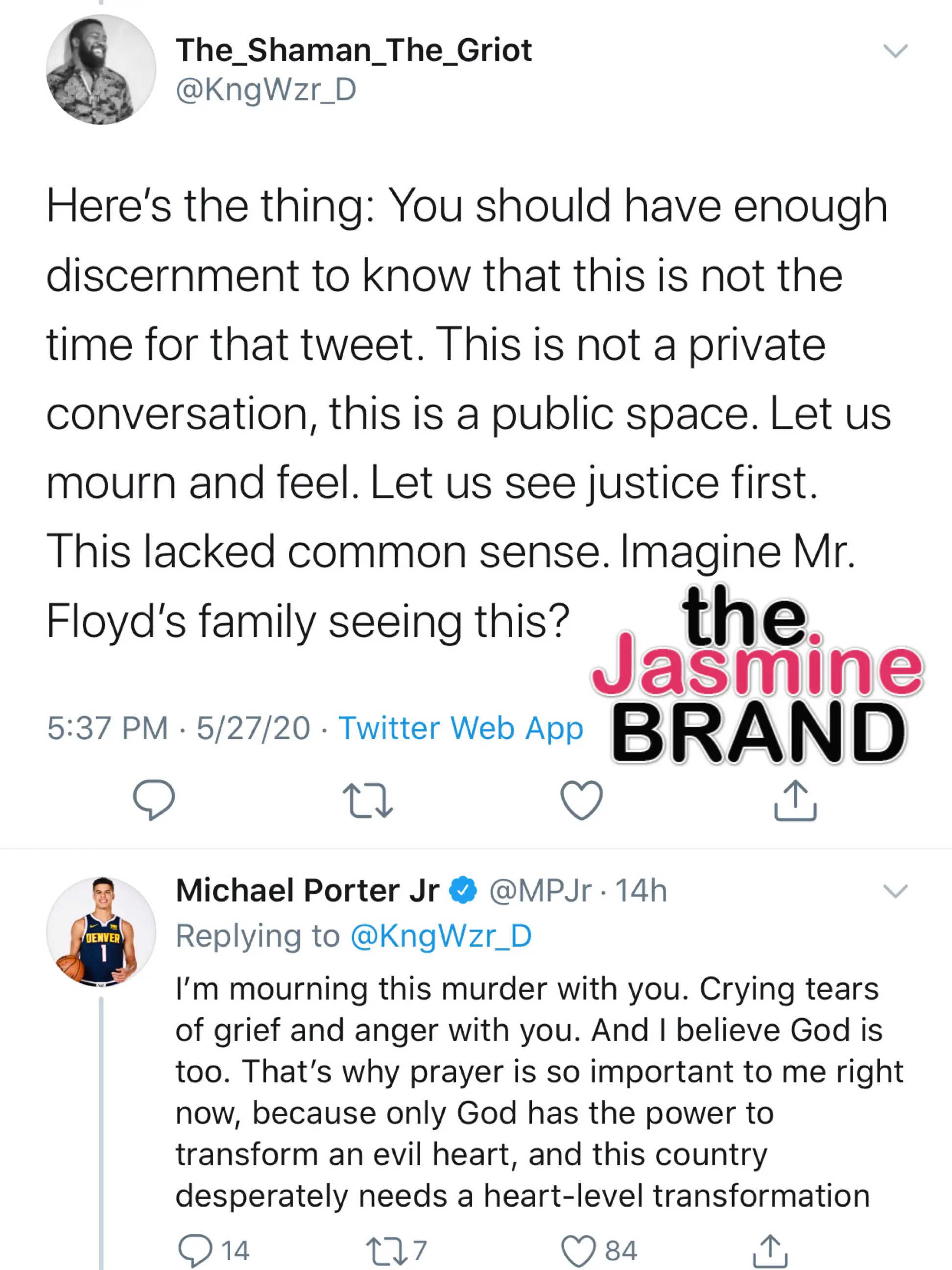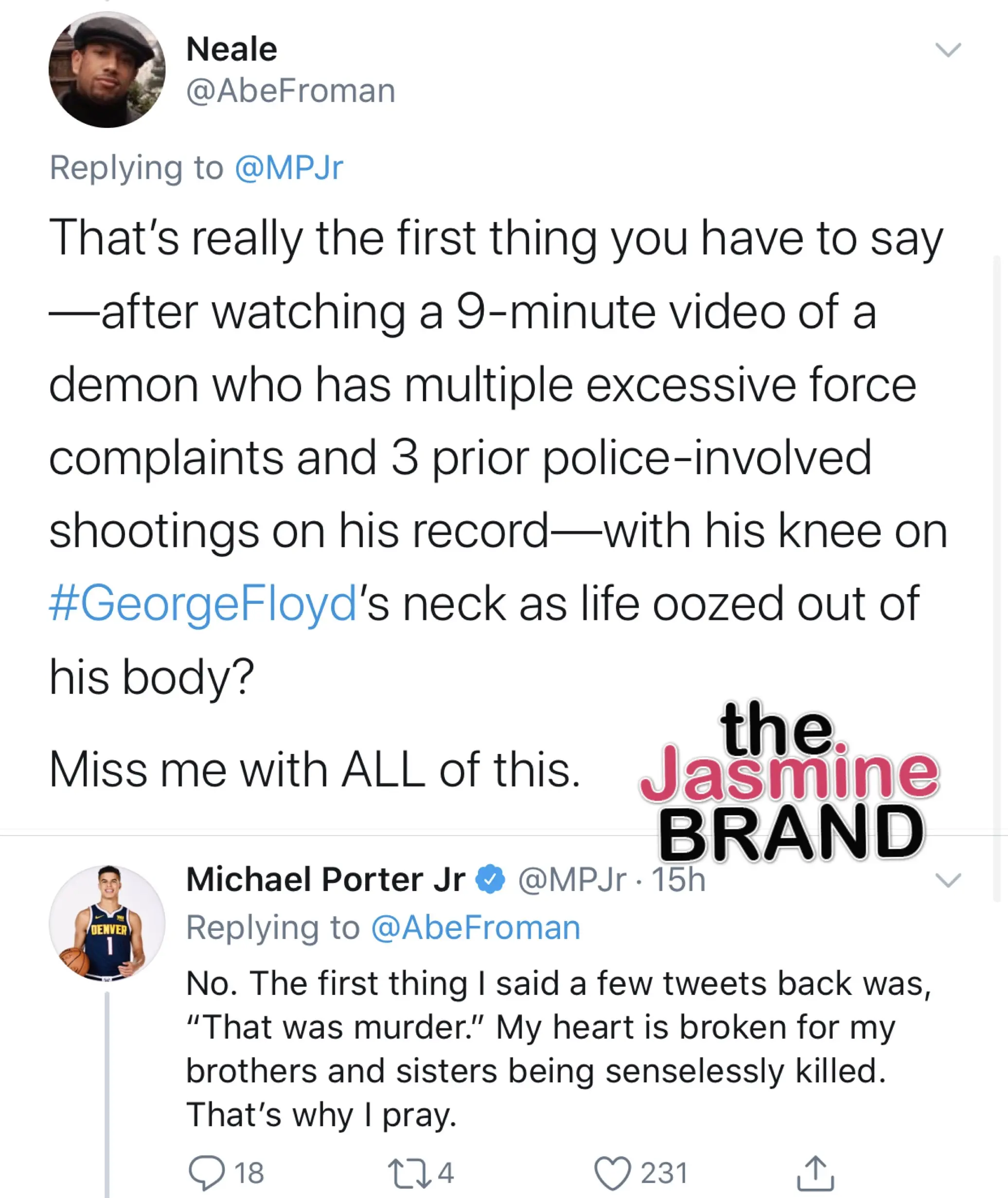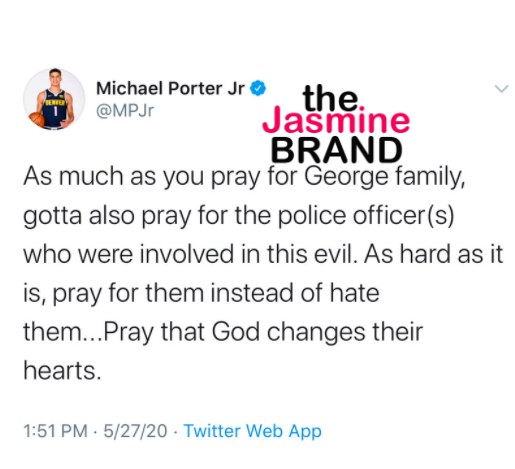 As the world continues to mourn the heart-wrenching death of George Floyd, Michael Porter, Jr. of the Denver Nuggets takes to Twitter to share his thoughts on how to cope with such a national systematic issue. The 21-year-old first-round pick said on Wednesday (May 27th), as evil as the tragedy is, there should be more thoughts and outpouring of prayer than hate for the officers involved in the viral clip.