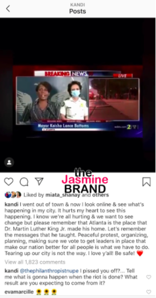 “I went out of town & now I look online & see what’s happening in my city. It hurts my heart to see this happening. I know we’re all hurting & we want to see change but please remember that Atlanta is the place that Dr. Martin Luther King Jr. made his home. Let’s remember the messages that he taught. Peaceful protest, organizing, planning, making sure we vote to get leaders in place that make our nation better for all people is what we have to do. Tearing up our city is not the way. I love y’all! Be safe! “
