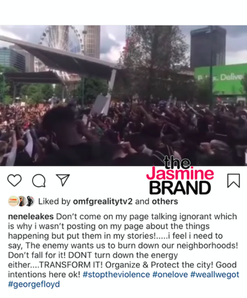 “Don’t come on my page talking ignorant which is why I wasn’t posting on my page about the things happening but put them in my stories!….. i feel i need to say, The enemy wants us to burn down our neighborhoods! Don’t fall for it! DONT turn down the energy either…. TRANSFORM IT! Organize & Protect the city! Good intentions here ok!”