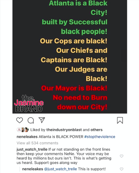 “Atlanta is a Black City! built by Successful black people! Our Cops are black! Our Chiefs and Captains are Black! Our Judges are Black! Our Mayor is Black! No need to Burn down our City!”