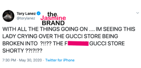 “WITH ALL THE THINGS GOING ON …. IM SEEING THIS LADY CRYING OVER THE GUCCI STORE BEING BROKEN INTO ?!!?? THE F*CKING GUCCI STORE SHORTY ??!?!??”