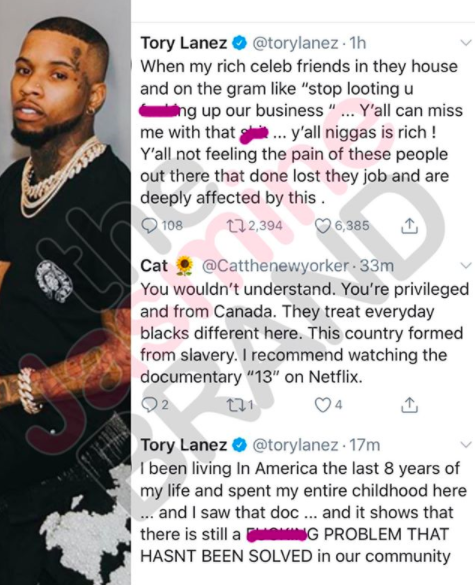 Tory Lanez isn’t a fan of what Shekinah had to say about looters in Atlanta. The “Love & Hip Hop: Atlanta” star tearfully pleaded for violent protesters in the city to stop tearing up businesses. The protests come days after video surfaced a white police officer, Derek Chauvin, pinning his knee into a black man, George Floyd’s, neck, leading to his death.