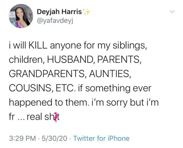 “i will KILL anyone for my siblings, children, HUSBAND, PARENTS, GRANDPARENTS, AUNTIES, COUSINS, ETC. if something ever happened to them. I’m sorry but i’m fr…real sh*t…ok i’m so tired of how the black community doesn’t speak up on the things that happens in the family …………… stop protecting thr men and women that touch children!!!!!”