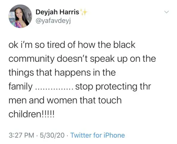 Deyjah Harris is now addressing the issue of the Black community’s silence regarding child molestation. She tweeted: