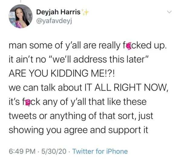 However, because of the recent nationwide response to the viral murder of Minneapolis man George Floyd, a Twitter user suggested that Deyjah’s timing was off. She responded to the now-deleted tweet: