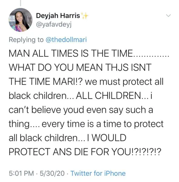“…WHAT DO YOU MEAN THJS ISNT THE TIME MARI!?…i can’t believe youd even say such a thing….everytime is a time to protect all black children…I WOULD PROTECT ANS DIES FOR YOU!?!?!?!?…man some of y’all are really f*cked up. it ain’t no “we’ll address this later” ARE YOU KIDDING ME!?! we can talk about IT ALL RIGHT NOW, it’s f*ck any of y’all that like these tweets or anything of that sort, just showing you agree and support it”