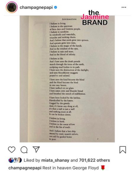 Over the weekend Drake posted a photo on Instagram of an affirmation with the caption reading “Rest In Heaven George Floyd.”