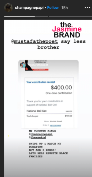 “My Toronto Kings @Champagnepapi @theweeknd, swipe up and match my donation but add 3 zeros! Lets help reunite black families.”