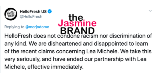 “HelloFresh does not condone racism nor discrimination of any kind. We are disheartened and disappointed to learn of the recent claims concerning Lea Michele. We take this very seriously and have ended our partnership with Lea Michele, effective immediately.”