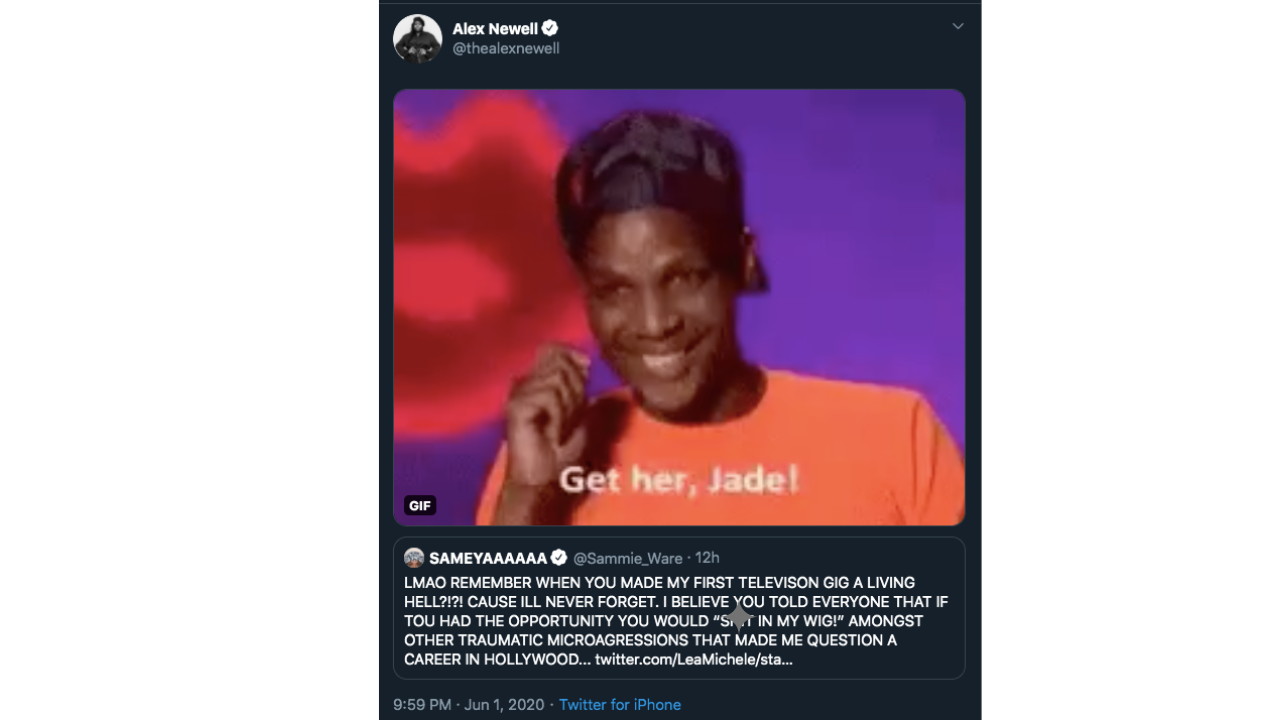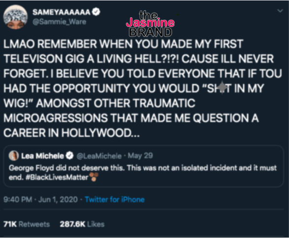 “LMAO REMEMBER WHEN YOU MADE MY FIRST TELEVISON GIG A LIVING HELL?!?! CAUSE ILL NEVER FORGET. I BELIEVE YOU TOLD EVERYONE THAT IF TOU HAD THE OPPORTUNITY YOU WOULD “SH*T IN MY WIG!” AMONGST OTHER TRAUMATIC MICROAGRESSIONS THAT MADE ME QUESTION A CAREER IN HOLLYWOOD…”