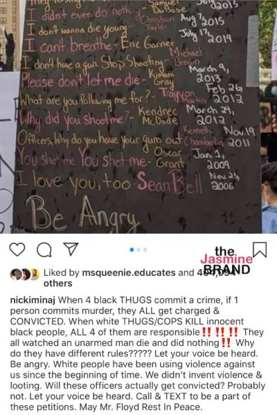 Captioned alongside a painstaking photo with the names, dates and last words of several black lives that were taken too soon, Nicki Minaj wrote,