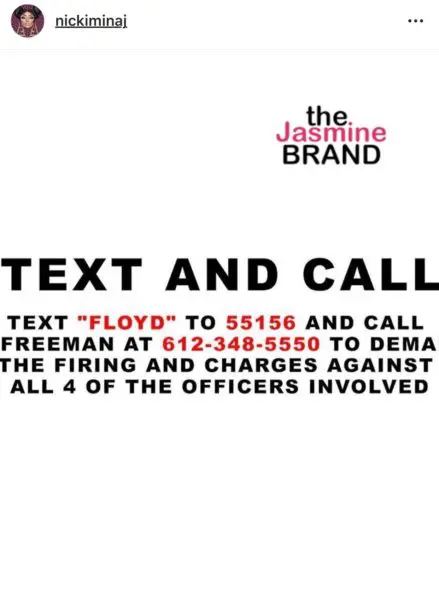 She encouraged her followers to get involved by texting and calling Minneapolis Mayor, Jacob Frey, as well as signing the petition for all four officers to be charged in the death of George Floyd.