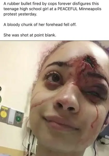 “Before you swipe – If you’re squeamish – warning – these are SOME my wounds up close. The most obvious are from rubber bullets. They look gross but I was blessed to be shot directly from close range and not have much worse, ive posted some in my stories. These things HURT and are DANGEROUS. The dude was aiming for folks HEADS. Rubber bullets have killed folks and can cause permanent damage, brain damage, concussions etc. Swipe further to see some of the officers. I can see some of their names but their badge numbers were on the back of their helmets. Purposeful. ONE OF them removed his name. Others obscured theirs. I need the names and badge numbers. DM them and any other proof to @alwaysbewright Let’s do this. And together let’s end this legacy of slave catching and #DefundPolice#DefendBlackLife(check out @mvmnt4blklivesnationwide campaign for US ??)”