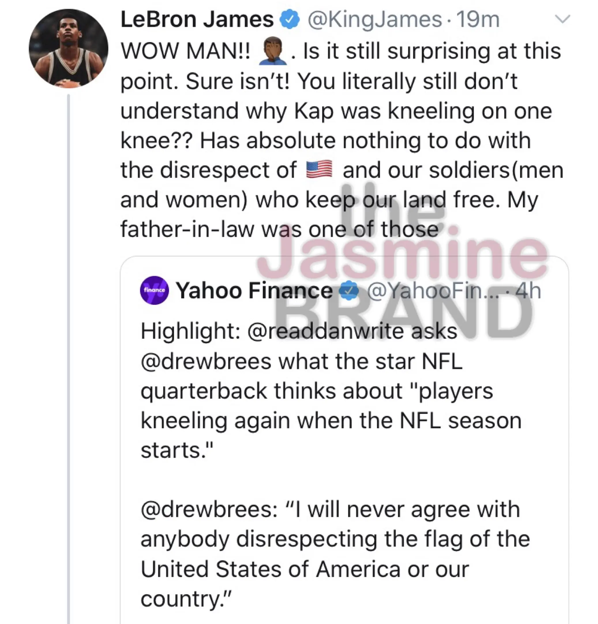 Los Angeles Lakers star LeBron James took to Twitter and responded to Brees’ remarks on protests during the national anthem. LeBron James has been a continued supporter of former NFL star Colin Kaepernick, who was allegedly blackballed from the league after he knelt during the national anthem in 2016.