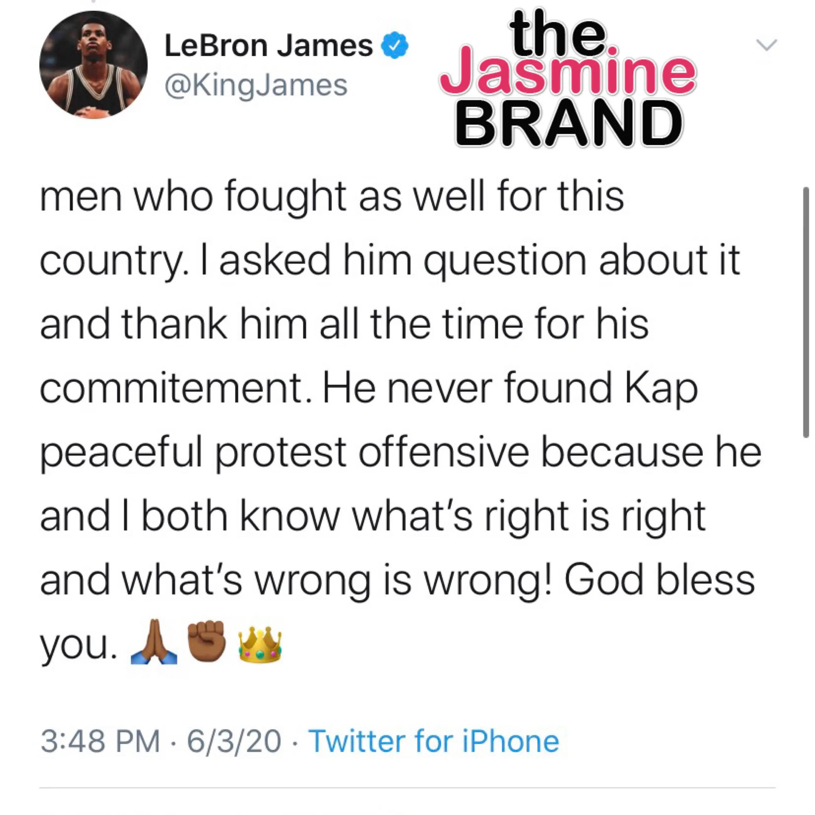 In addition, James says he’s reached out the military personnel who never found Colin Kaepernick’s protest offensive,