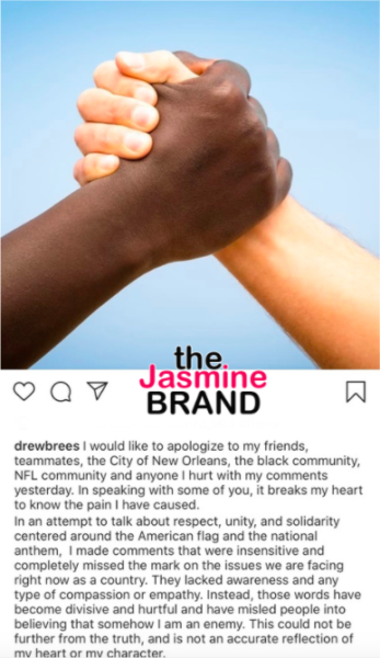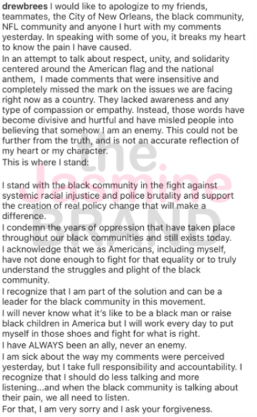 Brees later issued a statement clarifying his thoughts on how to properly protest in the NFL, telling ESPN,
