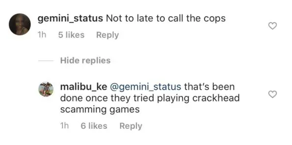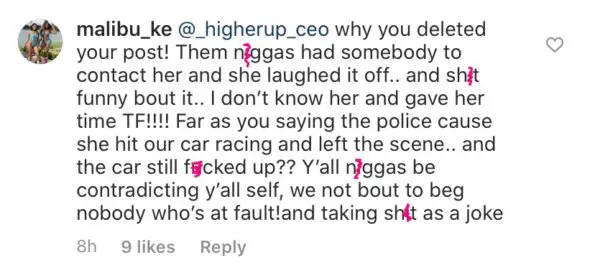 Malibu Ke says that upon contact, Young M.A. laughed off their requests for follow-up on the payment she promised at the scene of the accident: