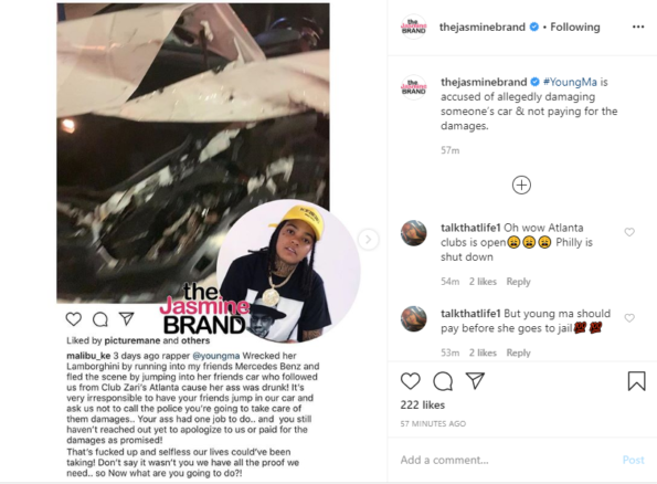 “3 days ago rapper @youngma Wrecked her Lamborghini by running into my friends Mercedes Benz and fled the scene by jumping into her friends car who followed us from Club Zari’s Atlanta cause her a** was drunk! It’s very irresponsible to have your friends jump in our car and ask us not to call the police you’re going to take care of them damages..”