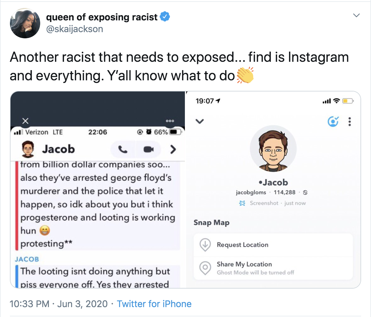Since June 3, Skai Jackson has revealed alleged racist individuals by tweeting their name, background information, and providing photos for Twitter users to see. Her first example was allegedly Jacob, a Snapchat user exposed via the app’s messages.