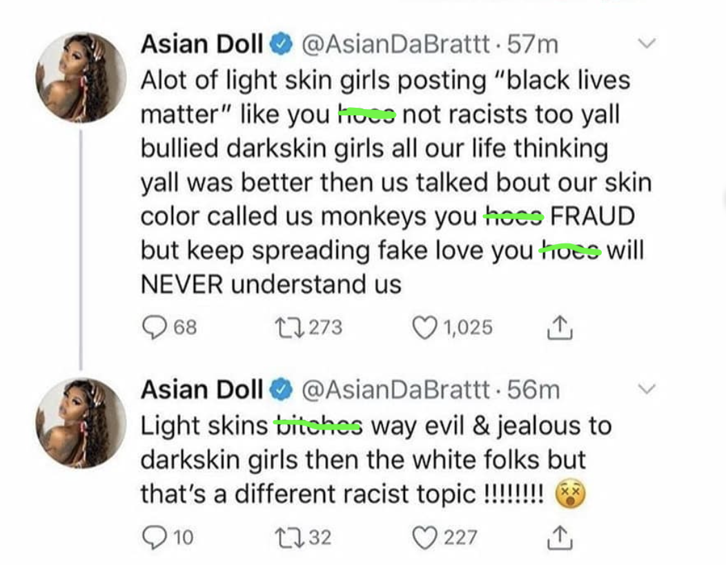 Rapper Asian Doll took to her twitter to discuss her views on lighter skinned black women posting about Black Lives Matter. In a now deleted tweet, Asian Doll wrote,