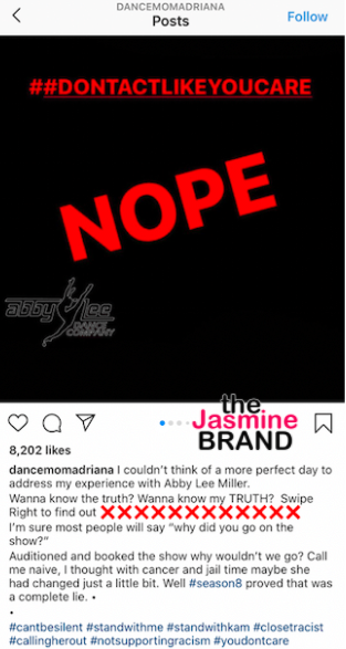 Adriana Smith’s accusations came after Abby Lee Miller appeared to support protesters on #BlackoutTuesday via Instagram amid the national protests and civil unrest after the death of George Floyd. She has since deleted the post, but not before Adriana Smith responded with a post on her own page, calling out Miller.