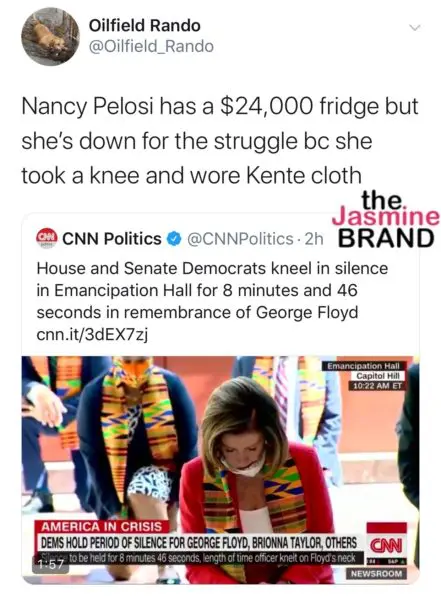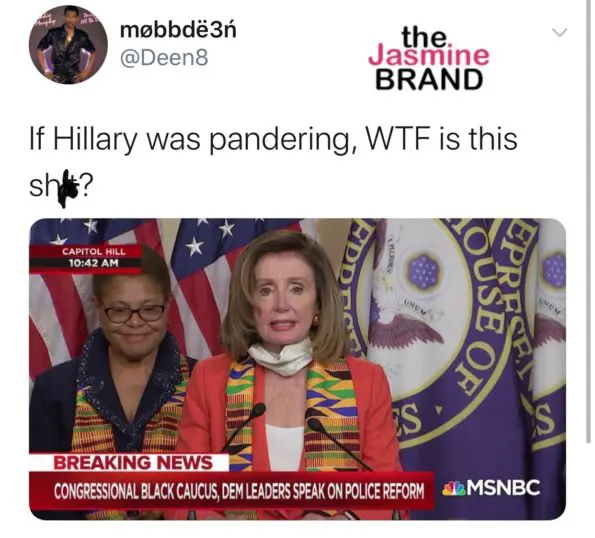 Twitter is having a field day after a video of House and Senate Democrats kneeling and wearing kente cloth surfaced. In the clip, the legislators kneeled for 8 minutes and 46 seconds in remembrance of George Floyd. The group, which consisted of Hilary Clinton, Kamala Harris, and Nancy Pelosi, to name a few, came together at the United States Capitol in Emancipation Hall, named by Congress to recognize the enslaved laborers and craftsmen who helped build the U.S. Capitol.