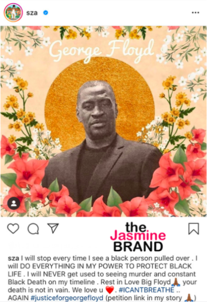 SZA also made a pledge to pull over every time she sees a black person being arrested. She wrote in a post that demanded justice for George Floyd.