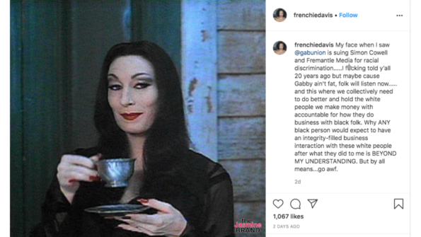 Former American Idol contestant, Frenchie Davis is also calling out the television host and executive producer for racial discrimination. On June 7th Frenchie Davis uploaded an image of the fictional character Morticia Addams, from the 1991 version of The Addams Family to her Instagram account. In the image, Morticia Addams has a smirk on her face while holding a silver teacup. Frenchie Davis captioned the photo,
