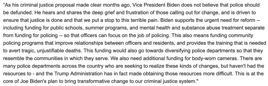 Following his remarks, his campaign spokesman, Andrew Bates, released a statement to farther explain Joe Biden’s comment towards why the police should not be defunded.