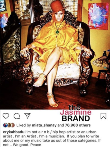 Erykah Badu, a black soulful singer-songwriter, noted two months prior (April 4) that she did not want to be labeled as an urban artist. In a picture post on Instagram, the 49-year-old songwriter wrote: