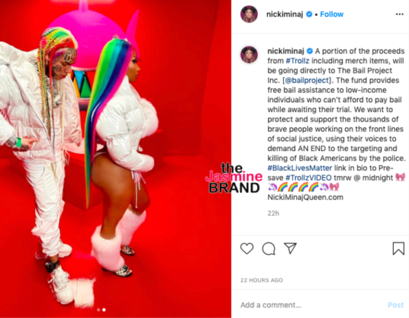 A portion of the proceeds from #Trollz including merch items, will be going directly to The Bail Project Inc. The fund provides free bail assistance to low-income individuals who can’t afford to pay bail while awaiting their trial. We want to protect and support the thousands of brave people working on the front lines of social justice, using their voices to demand AN END to the targeting and killing of Black Americans by the police. #BlackLivesMatter link in bio to Pre-save #TrollzVIDEO tmrw @ midnight ???????? NickiMinajQueen.com