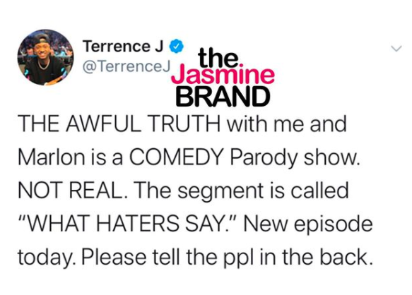 “THE AWFUL TRUTH with me and Marlon is a COMEDY Parody show. NOT REAL. The segment is called “WHAT HATERS SAY.” New episode today. Please tell the ppl in the back.”