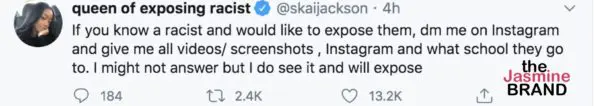 Actress Skai Jackson, has made it her business to expose all racists on Twitter, self-proclaiming herself as the “Queen Of Exposing Racists” on her Twitter account. The actress has used her page and her celebrity status to post receipts from various social media platforms, of people who have said something that was considered racist.