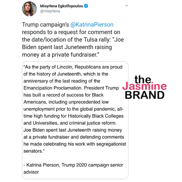 President Donald Trump announced the controversial rally, which marks his first since the coronavirus pandemic took over the world, to a roundtable group of African-American supporters on June 10 and said he’s “looking forward to it.” In response to President Trump‘s announcement, Trump campaign staffer Katrina Pierson compared his efforts to former Vice President Joe Biden and current presidential hopeful.