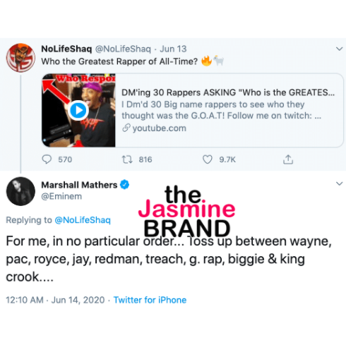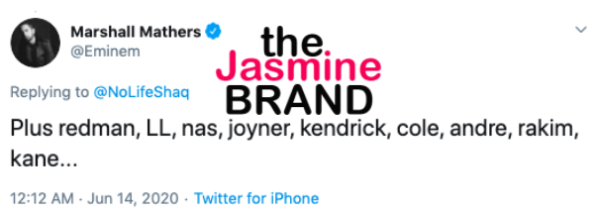 Eminem, born Marshall Mathers, responded to a tweet from a music fan on his Twitter Friday (June 13th), and said who he states are his greatest artists of all time. The account @NoLifeShaq shared a link to a Youtube video entitled,