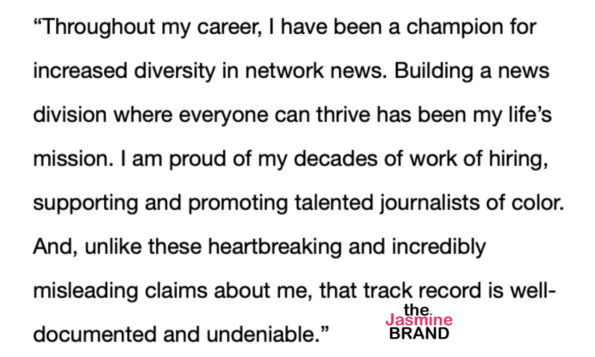 “Throughout my career, I have been a champion for increased diversity in network news. Building a new division where everyone can thrive has been my life’s mission. I am proud of my decades of work of hiring, supporting and promoting talented journalists of color. And, unlike these heartbreaking and incredibly misleading claims about me, that track record is well-documented and undeniable.”