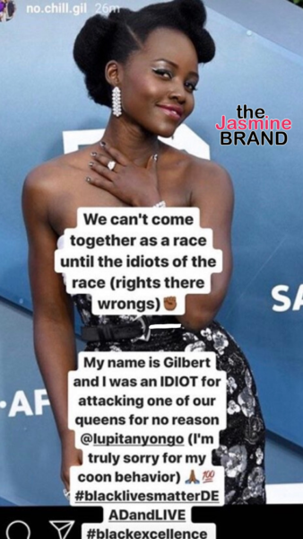 “My name is Gilbert, and I was an IDIOT, for attacking one of out queens for no reason, @lupitanyongo (I’m truly sorry for my coon behavior) #BlackLivesMatterDEADandALIVE #black excellence”