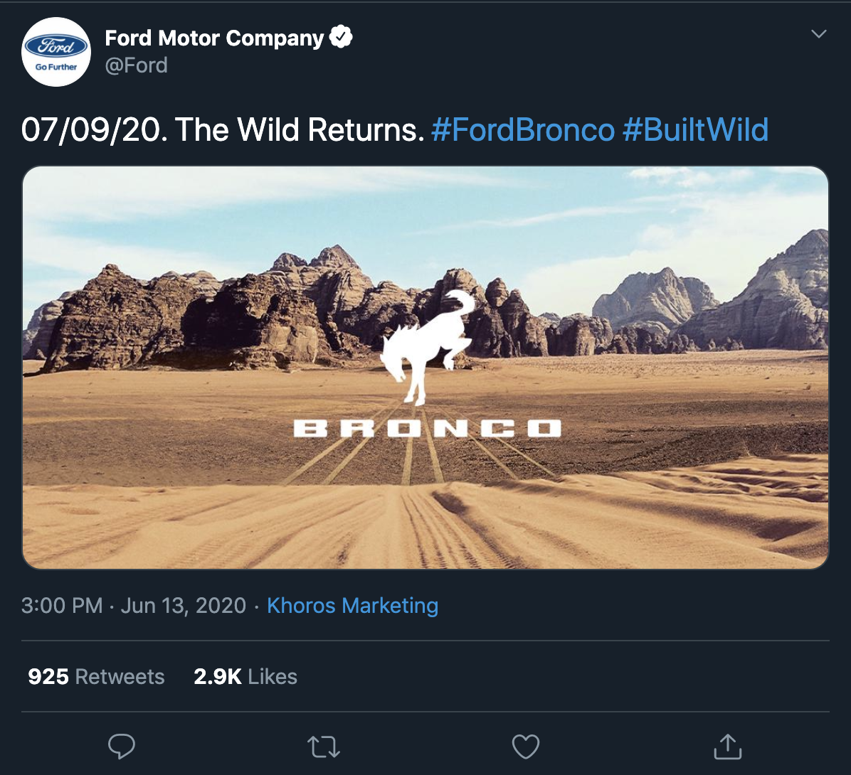 “07/09/20. The Wild Returns. #FordBronco #BuiltWild”