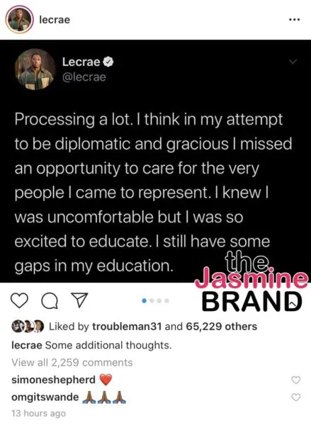 “I ended up having a conversation with him subsequently right after we talked, and then I talked to him again last night and let him know my views and my perspectives. Obviously, I wasn’t okay with it. And we can’t…just be doing this because it’s the in thing to do to talk about race on platforms. I didn’t have any ulterior motives other than to help and articulate some of what’s been going on in our world and in our culture…obviously, I’m not okay with changing white privilege to white blessing. That’s another privilege in itself…we talked about it, and we gon’ continue working through it.”