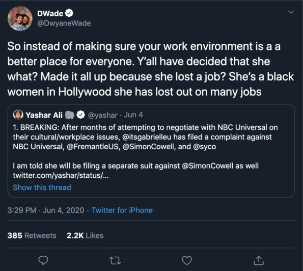 “I decided to participate in this investigation. Silly me, I thought ‘independent’ was independent. But when NBC and Fremantle and Syco pay for that investigation, they control it. They turn over what they believe to be inflammatory things, or things that are not advantageous to me. In the middle of an investigation about racism and discrimination? This is what’s happening from the top of the company.”