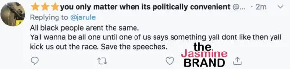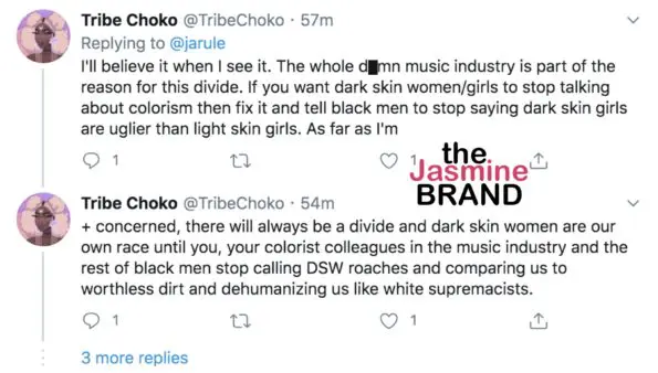 “I’ll believe it when I see it. The whole damn music industry is part of the reason for this divide. If you want dark skin women/girls to stop talking about colorism then fix it and tell black men to stop saying dark skin girls are uglier than light skin girls. As far as I’m concerned, there will always be a divide and dark skin women are our own race until you, your colorist colleagues in the music industry and the rest of black men stop calling DSW roaches and comparing us to worthless dirt and dehumanizing us like white supremacists.”
