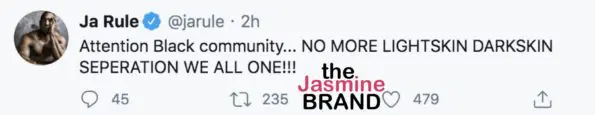 Rapper Ja Rule,44, (real name Jeffrey Bruce Atkins) used his platform on Twitter to speak out against colorism within the black community. The New York native is calling for Blacks of all shades to stand as one. In his first tweet, Ja Rule wrote: