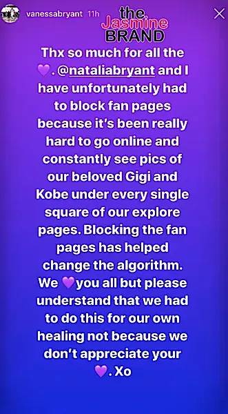 “Thx so much for all the [heart emoji] @Nataliabryant and I have unfortunately had to block fan pages because it’s been really hard to go online and constantly see pics of our beloved Gigi and Kobe under every single square of our explore page. Blocking the fan pages has helped change the algorithm. We [insert heart emoji] you all but please understand that we had to do this for our own healing not because we don’t appreciate your . xo.”