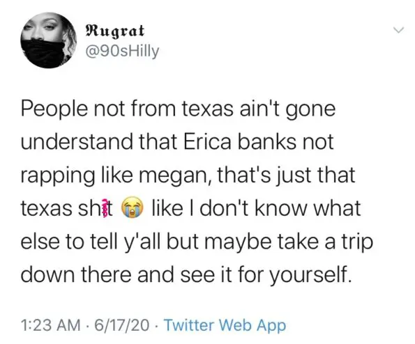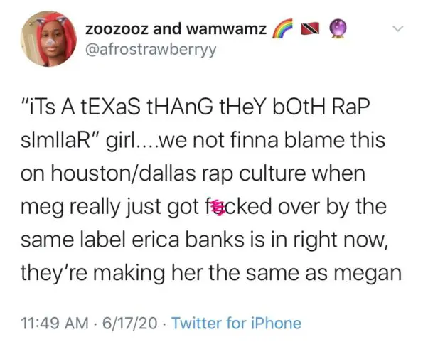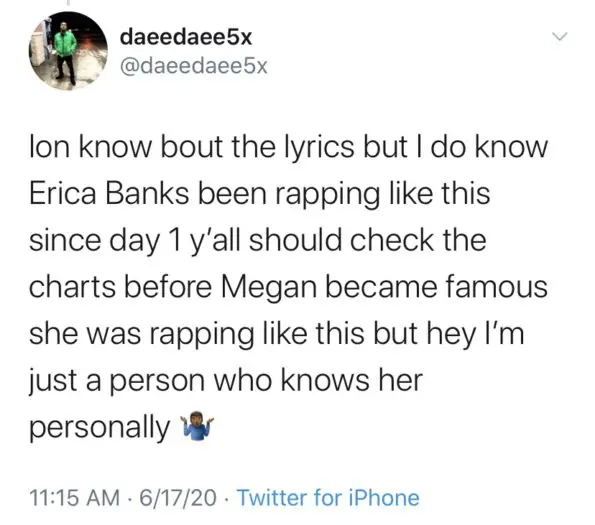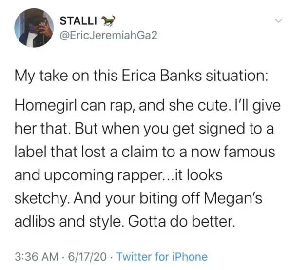 But Erica Banks insists that her style is authentic to her. She responded to the comparisons to Megan with this tweet: