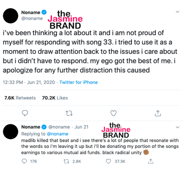 Update #2 (June 22nd): Noname appears to regret adding fuel to her and J. Cole’s recent feud. The rapper took to Twitter and apologized for getting involved, and taking attention away from the fight for equality. She tweeted,