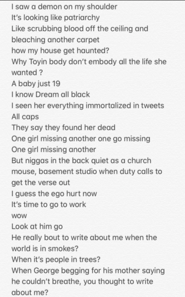 “He really bout to write about me when the whole world is in smokes?/When it’s people in trees?/ When George begging for his mother saying he couldn’t breathe, you thought to write about me?”