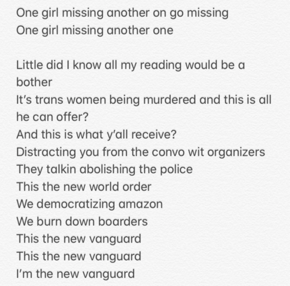 “Little did I know all my reading would be a bother/ It’s trans women being murdered and this is all he can offer?/ And this is what y’all recieve?/ Distracting you from convo wit organizers”